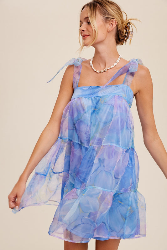 Blue Floral Organza Mini Dress