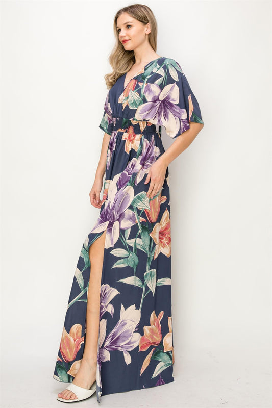 Navy Floral V-Neck Slit Maxi Dress