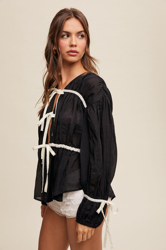 Olivia Oatmeal Satin Ribbon V-Neck Sweater