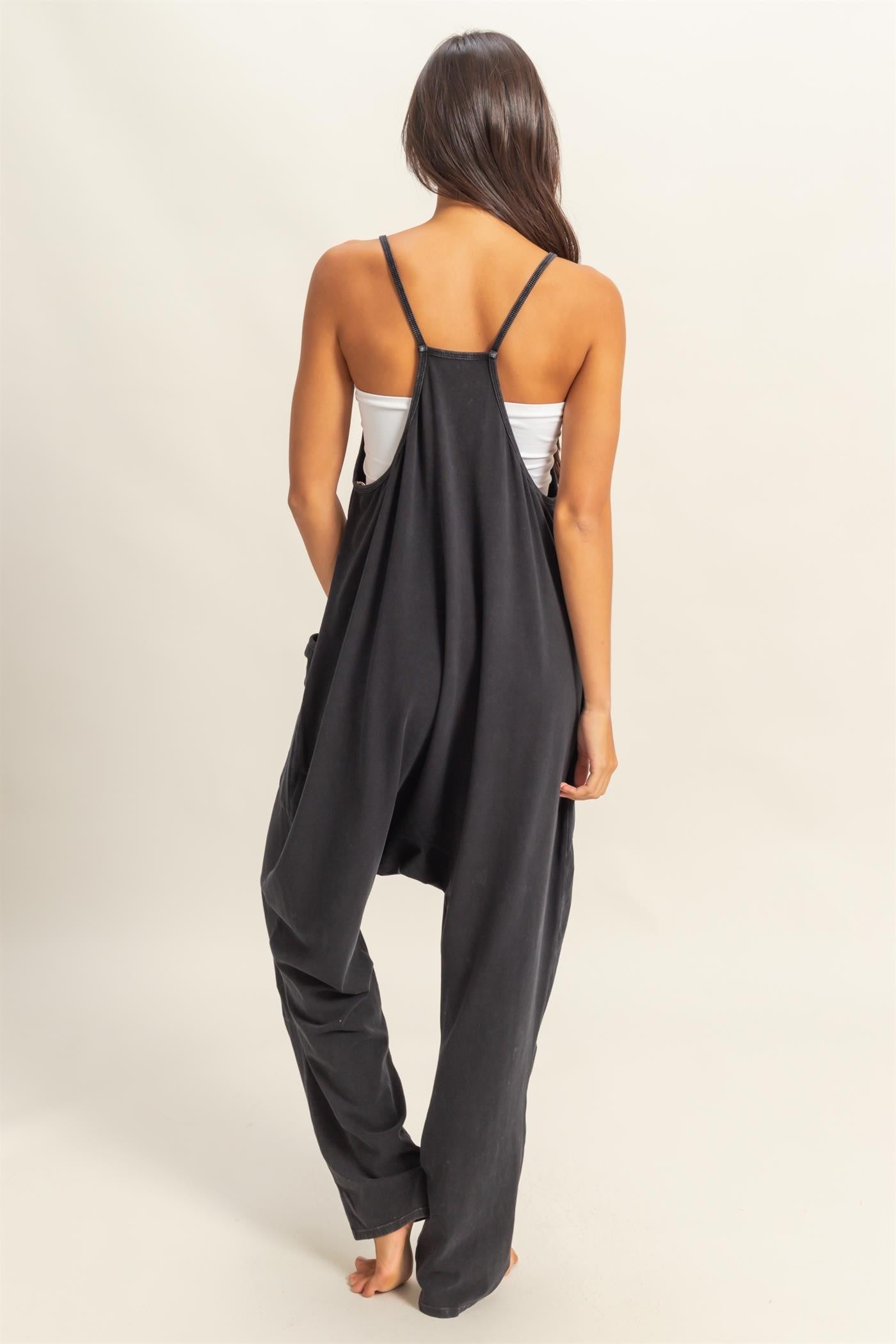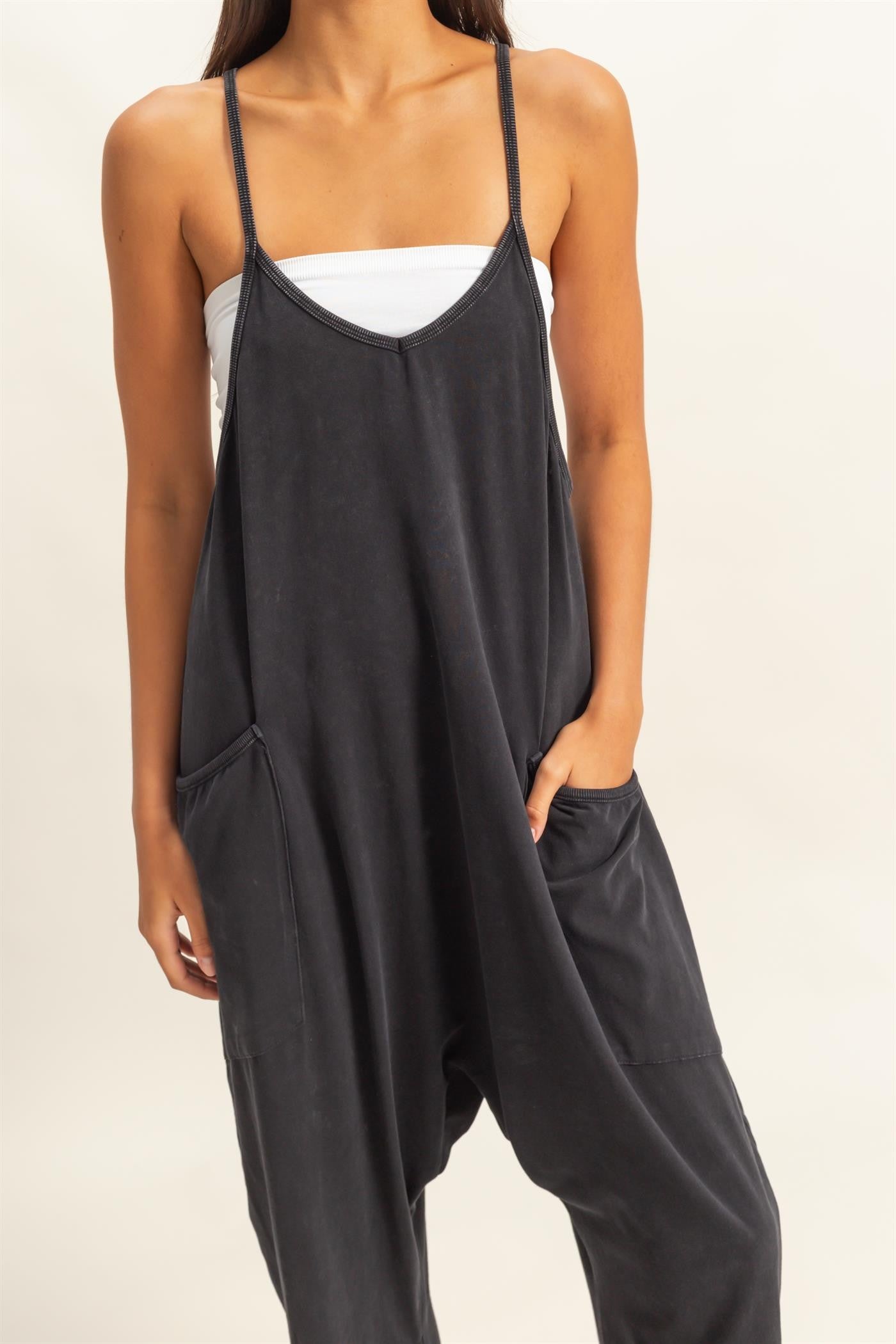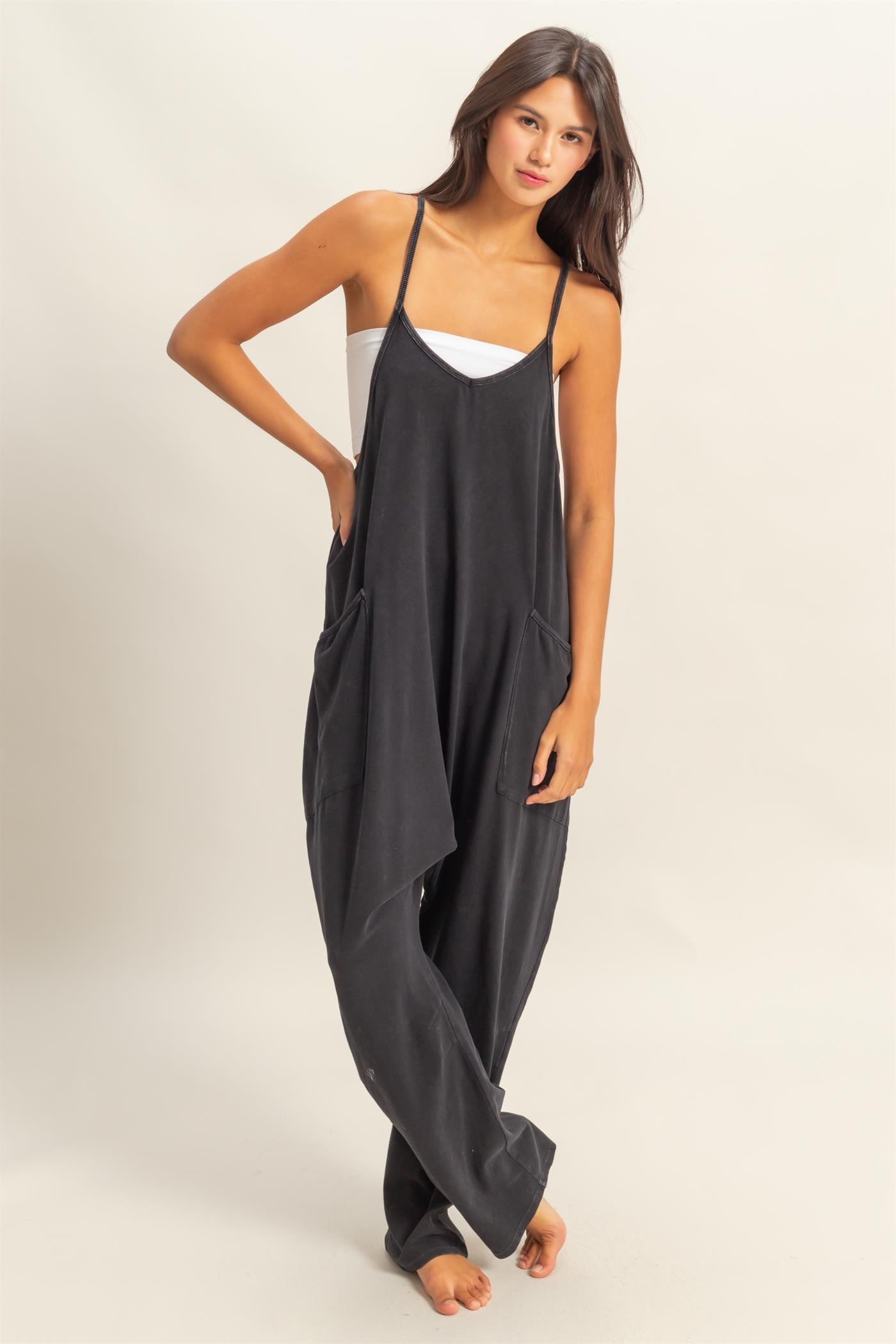 Introducing our new Relaxed Fit Mineral Washed Jumpsuit - the perfect combination of comfort and style! Made with a relaxed fit and mineral-washed fabric, this jumpsuit is perfect for lounging or running errands. Say goodbye to uncomfortable clothing and hello to effortless style!
